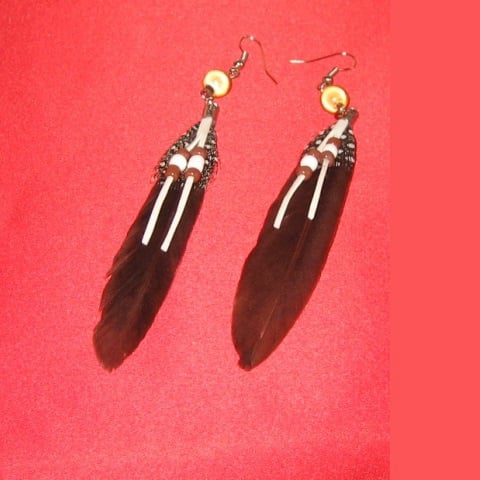Wit/rood/groen met panterfranjes, met indianenpruik en oorbellen.