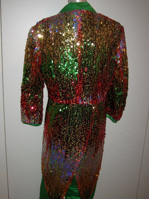 Bestaat uit groene pantalon en slippenjas, met rode hoed. Damesmaat 40 of herenmaat 48.