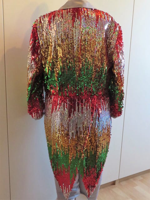 Bestaat uit pantalon en slippenjas, met zilveren hoed. Damesmaat 42 of herenmaat 50.