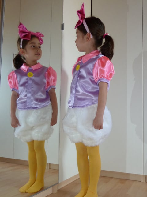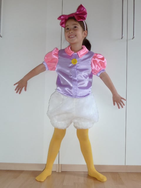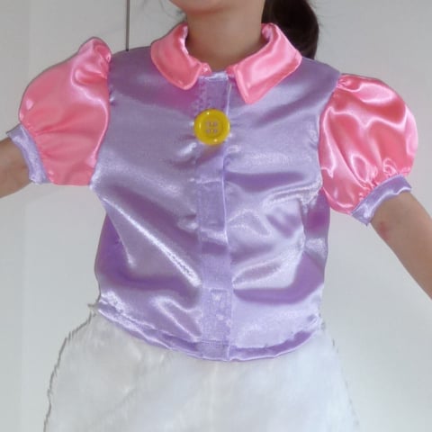 Bestaat uit broek, blouse, maillot, en strik.
