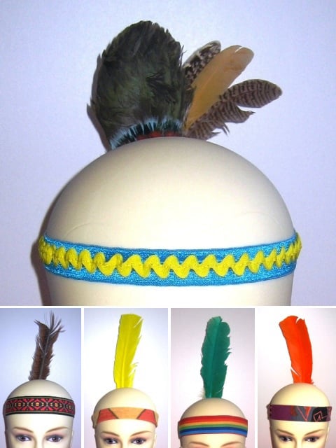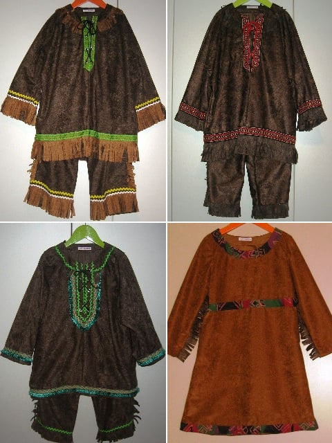 Verschillende indianenpakjes voor jongens en voor meisjes, compleet met hoofdtooien.