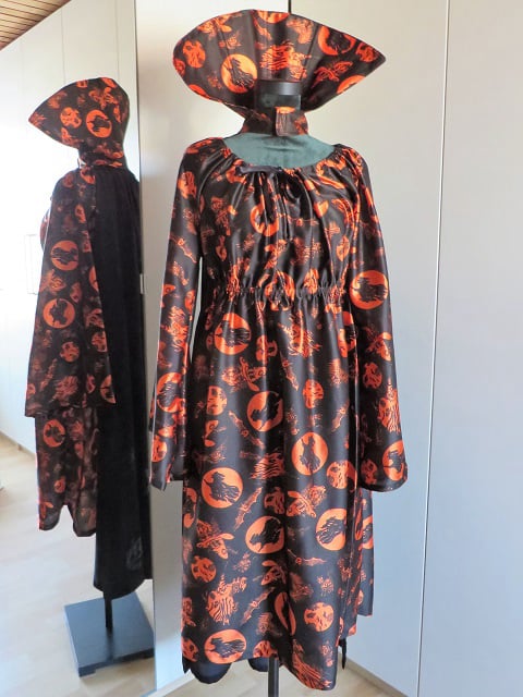 Bestaat uit 2 delen: jurk en losse cape met pompoen-print. Bijpassende heksenhoed apart verkrijgbaar.