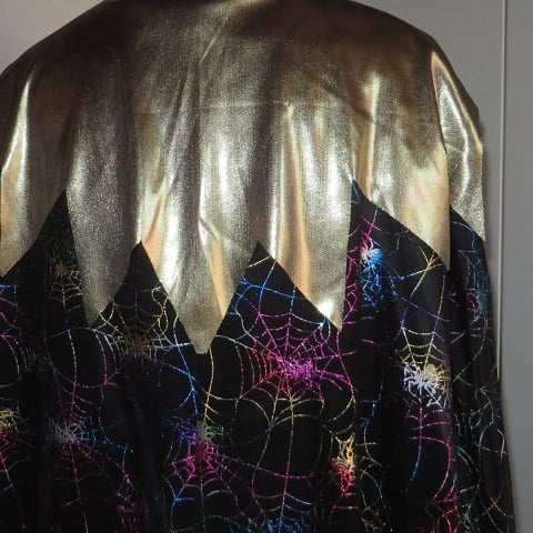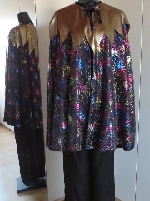 Set bestaat uit 3 delen: zwarte broek, cape met spinnenweb-print en gouden kraag.