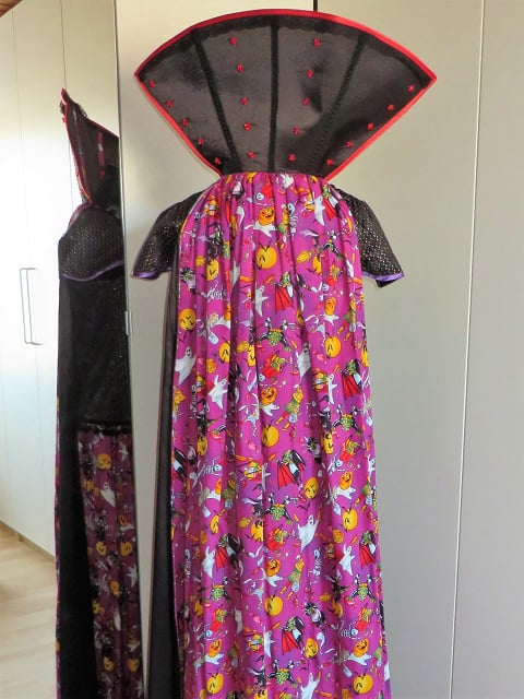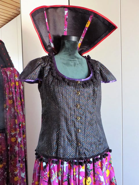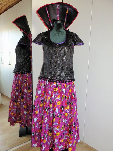 Set bestaat uit 2 delen: lange rok en blouse met cape. Te combineren met heksenhoed en/of eventueel petticoat, beiden apart verkrijgbaar.