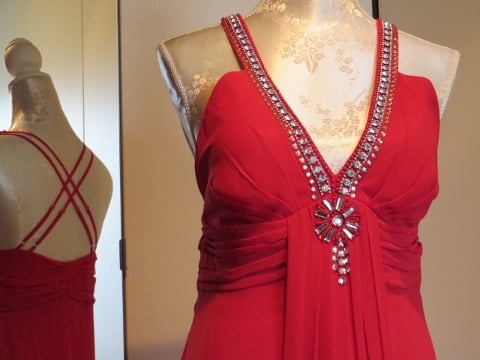 Rode lange gala jurk met sjaal. Beschikbaar in maten 38/40 en 42/44.