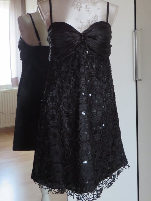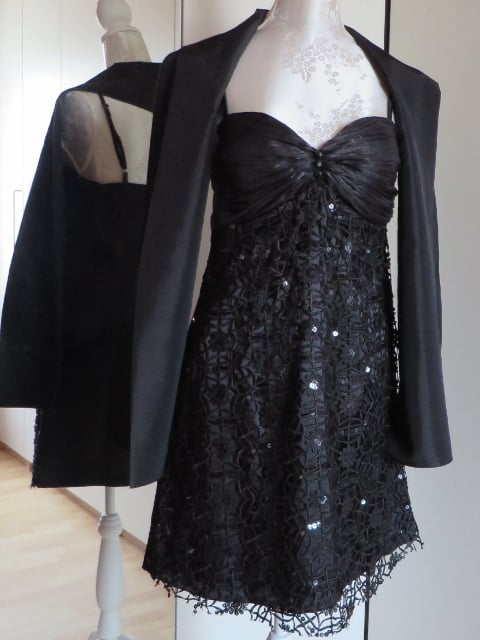 Zwarte gala jurk met kant en sjaal, kort model. Maat 44.