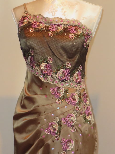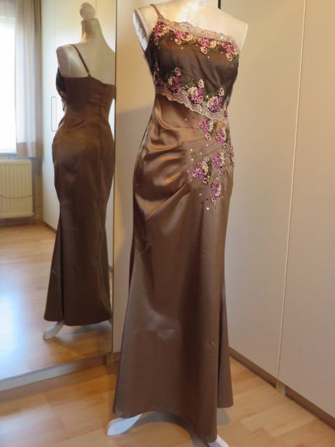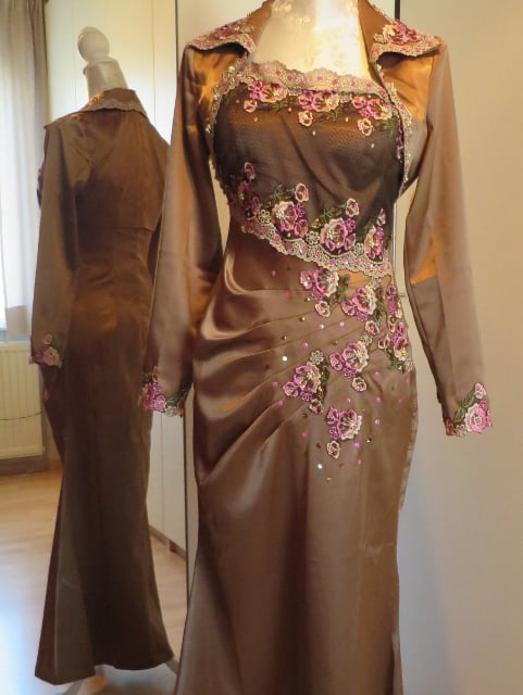 Bruine lange gala jurk met bloemen, spagettibandje en bolero jasje. Maat 34/36.