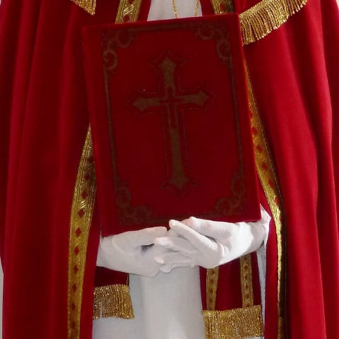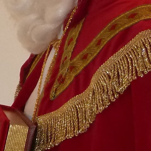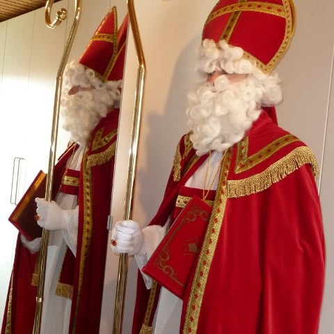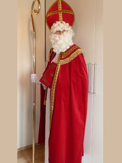 Complete outfit met tabbard (onderrok), albe (onderkleed), cingel (koord), stola, kazuifel (opperkleed), baard, pruik, wenkbrouwen, mijter, staf, kruis, handschoenen, ring, en bril. Eventueel extra bij te huren: het grote boek van Sinterklaas. Schmink kan eventueel bijgeleverd worden.