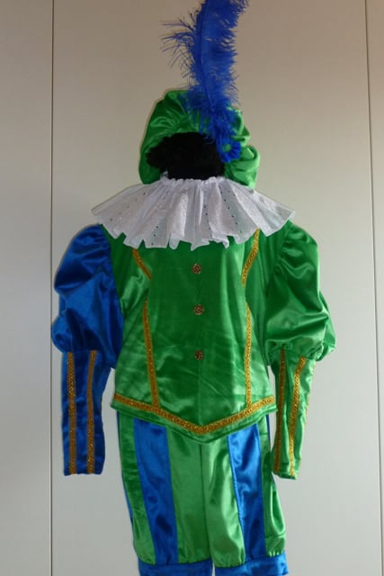Bestaat uit broek, zwarte maillot, jas, kraag, pruik (zwart / bruin / regenboog), haarnetje, col, muts met veer, handschoenen, oorbellen, roe, en zak. Schmink voor zwarte piet, roetveegpiet of regenboogpiet en lippenstift zijn eveneens verkrijgbaar.
