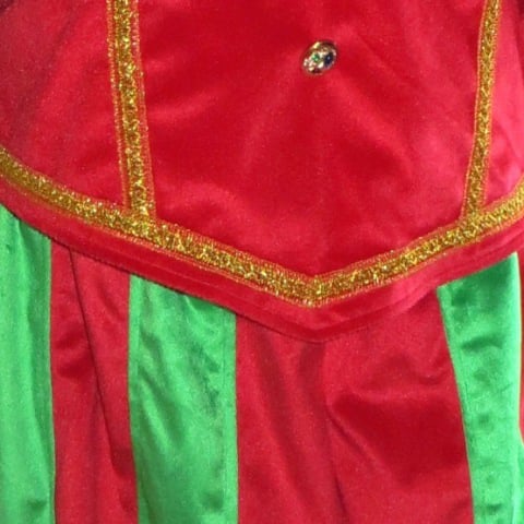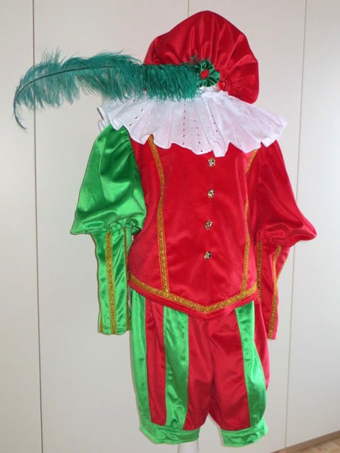 Bestaat uit broek, zwarte maillot, jas, kraag, pruik (zwart / bruin / regenboog), haarnetje, col, muts met veer, handschoenen, oorbellen, roe, en zak. Schmink voor zwarte piet, roetveegpiet of regenboogpiet en lippenstift zijn eveneens verkrijgbaar.