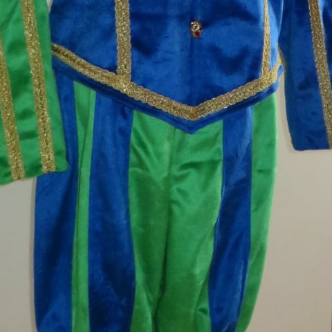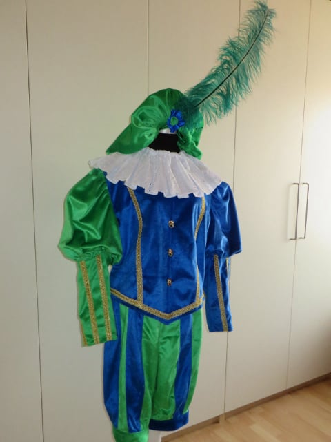 Bestaat uit broek, zwarte maillot, jas, kraag, pruik (zwart / bruin / regenboog), haarnetje, col, muts met veer, handschoenen, oorbellen, roe, en zak. Schmink voor zwarte piet, roetveegpiet of regenboogpiet en lippenstift zijn eveneens verkrijgbaar.