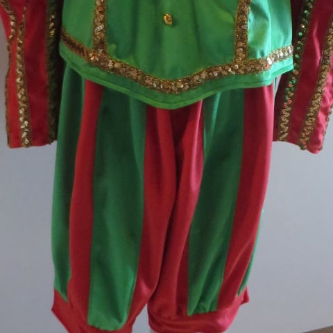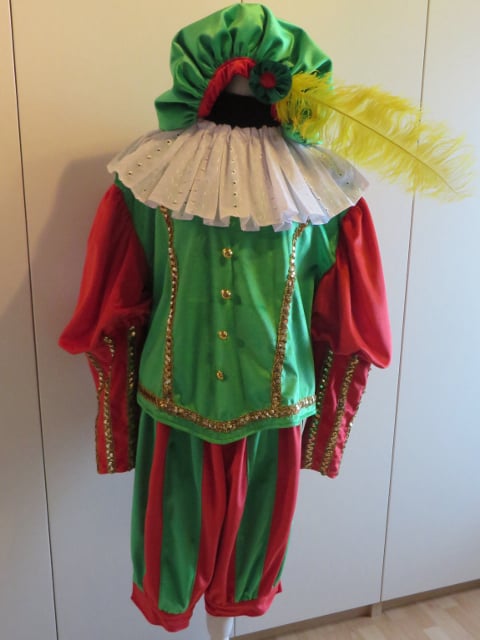 Bestaat uit broek, zwarte maillot, jas, kraag, pruik (zwart / bruin / regenboog), haarnetje, col, muts met veer, handschoenen, oorbellen, roe, en zak. Schmink voor zwarte piet, roetveegpiet of regenboogpiet en lippenstift zijn eveneens verkrijgbaar.