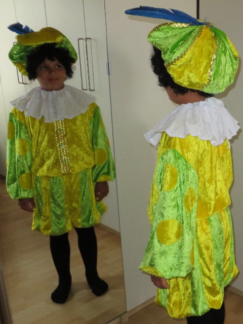 Bestaat uit broek, maillot, jas, kraag, pruik en muts. Schmink en lippenstift is eveneens verkrijgbaar.