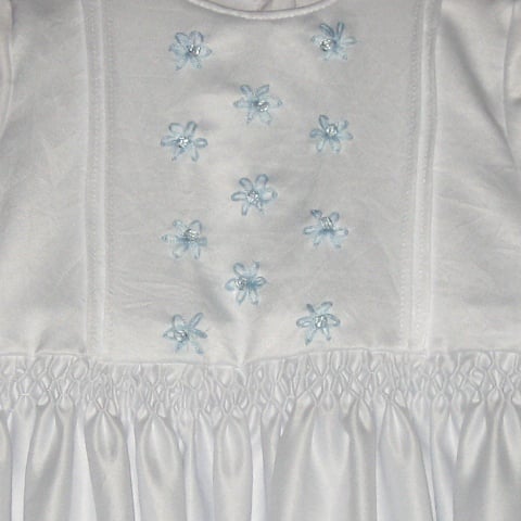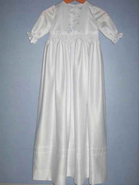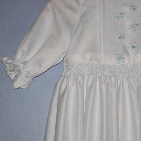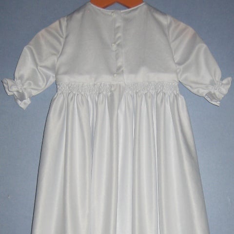 Deze traditionele doopjurk (voor jongens en meisjes) is bijzonder door het smockwerk, de naaldplooitjes en het borduurwerk met glaskraaltjes. De zacht glanzende soepele stof maakt de jurk extra feestelijk. Het klassieke mutsje maakt het compleet.