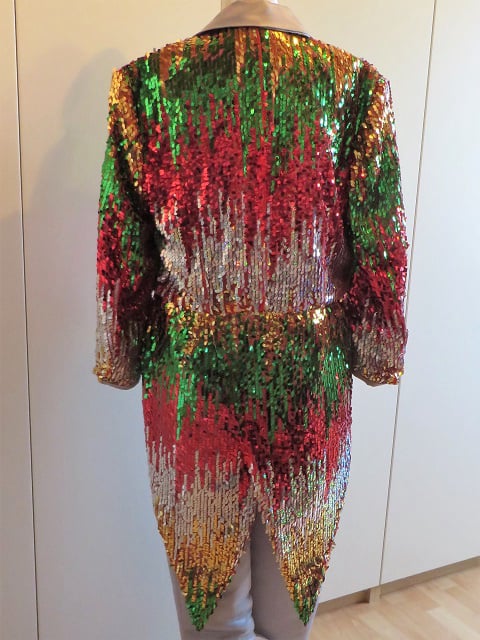 Bestaat uit pantalon en slippenjas, met zilveren hoed. Damesmaat 40 of herenmaat 46.