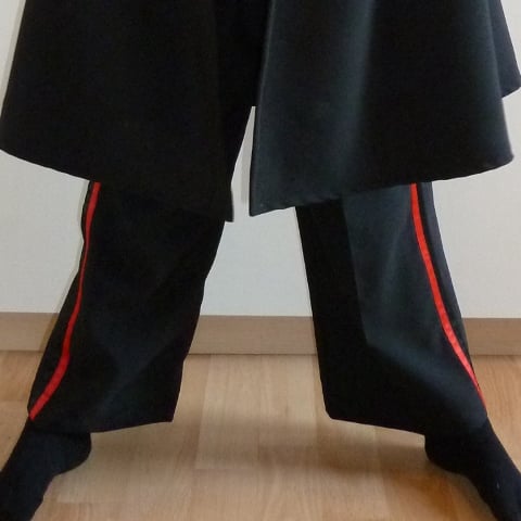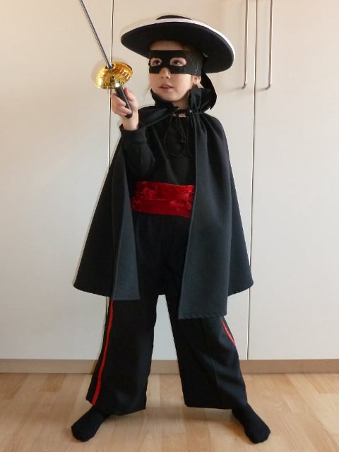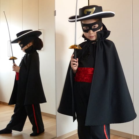 Bestaat uit broek, shirt, cape, band, hoed, masker, sabel.