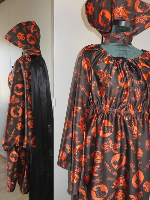 Bestaat uit 2 delen: jurk en losse cape met pompoen-print. Bijpassende heksenhoed apart verkrijgbaar.