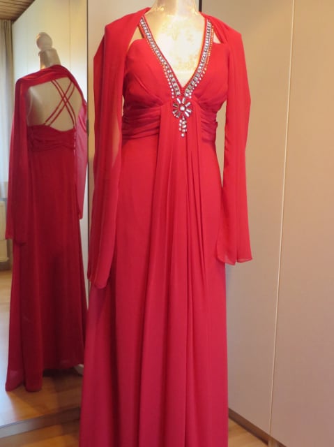 Rode lange gala jurk met sjaal. Beschikbaar in maten 38/40 en 42/44.