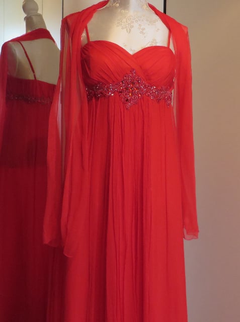 Rode lange gala jurk in 100% zijde, met spagetti bandjes en sjaal. Maat 38.