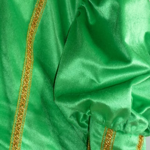 Bestaat uit broek, zwarte maillot, jas, kraag, pruik (zwart / bruin / regenboog), haarnetje, col, muts met veer, handschoenen, oorbellen, roe, en zak. Schmink voor zwarte piet, roetveegpiet of regenboogpiet en lippenstift zijn eveneens verkrijgbaar.