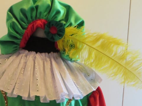 Bestaat uit broek, zwarte maillot, jas, kraag, pruik (zwart / bruin / regenboog), haarnetje, col, muts met veer, handschoenen, oorbellen, roe, en zak. Schmink voor zwarte piet, roetveegpiet of regenboogpiet en lippenstift zijn eveneens verkrijgbaar.